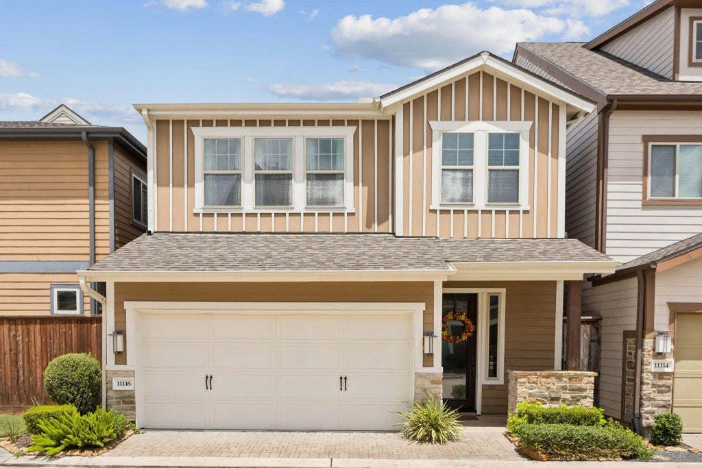 Welcome to 11116 Sherwood Oak Lane in Enclave at Sherwood Forest. This wonderful 3 bedroom, 2.5 bathroom home built by David Weekley boasts open concept first floor living, high ceilings, and wood floors throughout. Kitchen opens to living and dining room and features a large eat-in island with granite countertops, stainless steel appliances, and a pantry. Enjoy lots of natural light and access to large grass shared lawn. All bedrooms and laundry are located on the 2nd floor. Spacious primary suite with wood floors and a wall of windows with ensuite bathroom that offers tile floors, granite countertops, dual sinks, a walk-in shower, soaking tub, and walk-in closet. Two additional secondary bedrooms both generous in size include wood flooring and large closets. Updates include: new washer, refrigerator, dishwasher, garage door, microwave, and new roof. Zoned to SBISD schools. Don't miss out on this gem!