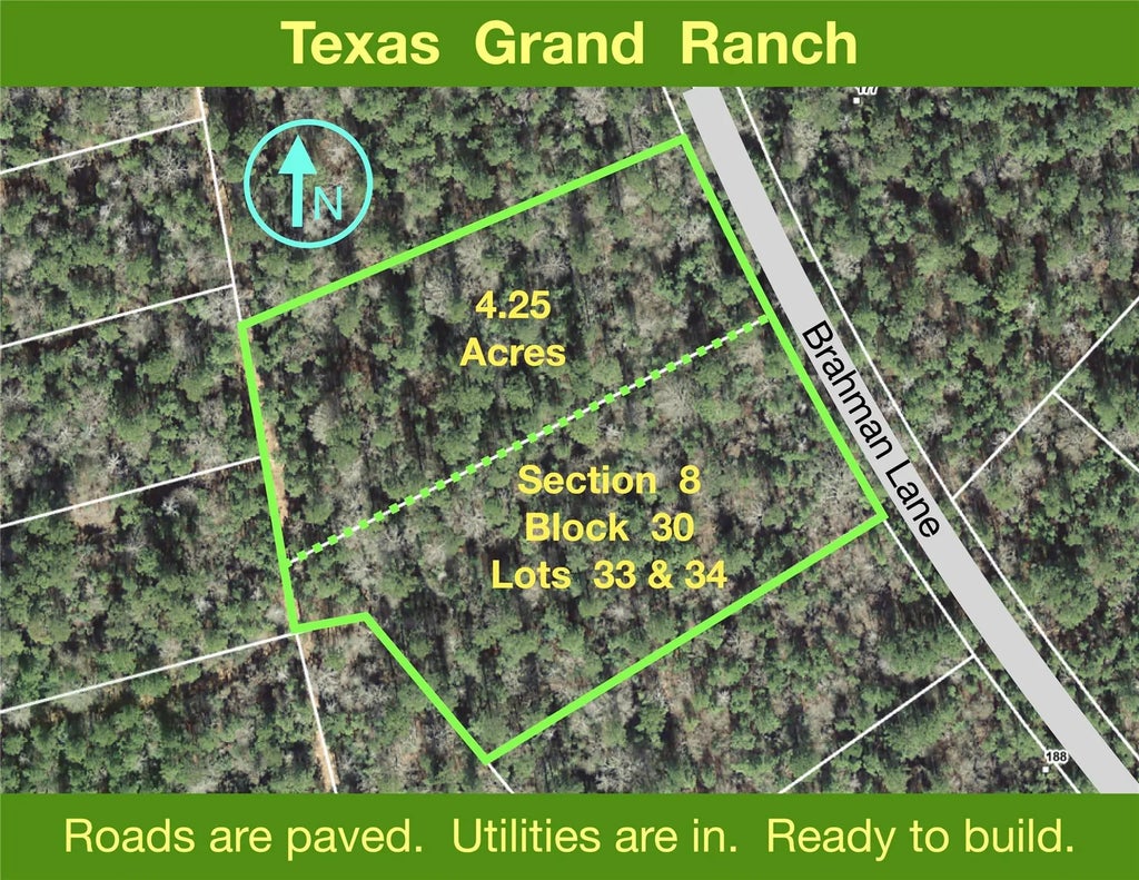 4.25 ACRES > HARD TO FIND - DOUBLE-SIZED PROPERTY > LOT 34 BACKS UP TO LARGE DETENTION EASEMENT FOR EXTRA PRIVACY > Ready for peace & quiet & privacy? Ready to build. Start building whenever you want. Choose your own builder. EZ access to I-45. Texas Grand Ranch is a large lot, wooded community in the rolling hills. Country lifestyle for your custom forever home. Mature trees, paved roads, water & HIGH SPEED fiber optic internet. Covered pavilions, parks, ponds, playgrounds, BBQ areas. Minutes from shopping, dining, schools, hospitals, and entertainment. Low taxes - No MUD tax. HIGH & DRY - Average elevation is 325’ ASL. Surrounded by Nat’l Forest (161,508 acres) & State Park (2,083 acres) with 100’s of miles of hiking, biking and horseback riding – boat launches & beaches. Come home to Texas Grand Ranch.