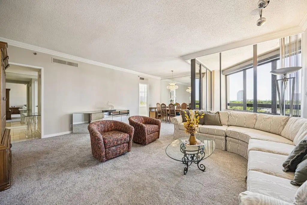 This light filled 2/2 corner unit at the classic St James is one of the few floor plans with a kitchen window and two bay windows in the oversized primary bedroom. Upgrades include a fresh coat of paint throughout ('25). The living room carpet was replaced ('25), and there is a dedicated space for a dining room table and room for two seating areas. Kitchen and primary bathroom counters were replaced (yr unknown). The secondary bedroom, which is currently being used as a den, has a built desk and cabinets, and recently re-finished hardwood floors. Building hallways are being updated, and this floor is complete. The full service building has a 24 hr concierge and valet, a party room with a warming kitchen, a library, fitness center, heated pool, pickle ball and tennis courts. Four updated guest suites are for owners guests. There are two assigned parking places, a storage room and onsite management five days a week. Tanglewood/Galleria area dining and shopping. Don't miss this one.