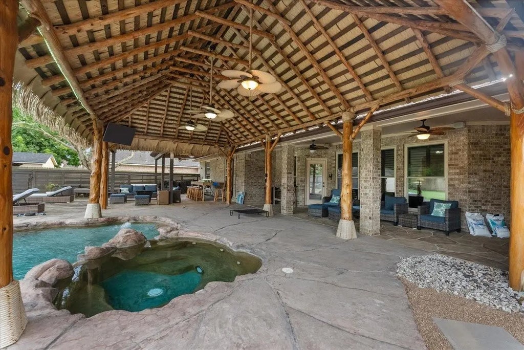 Welcome to 704 Heritage Oaks Drive — a showstopping lakefront retreat in one of Angleton’s most established and sought-after neighborhoods. Perfectly positioned for both serenity and convenience, this home offers peaceful waterfront views just minutes from Highway 288 for an easy commute. From the dramatic waterfall saltwater pool and spa to the private guest suite, every detail blends upscale comfort with smart, resort-style living. Recent upgrades include a new roof (2024), storm-impact windows, synthetic palapas, and water-resistant flooring throughout. Inside, you’ll find soaring ceilings, a chef’s kitchen, a media room with projector and Murphy bed, and smart features like central vacuum, whole-home audio, and remote security. Set on a half-acre lot with a 3-car garage and workshop—this one truly has it all. Schedule your private tour today!