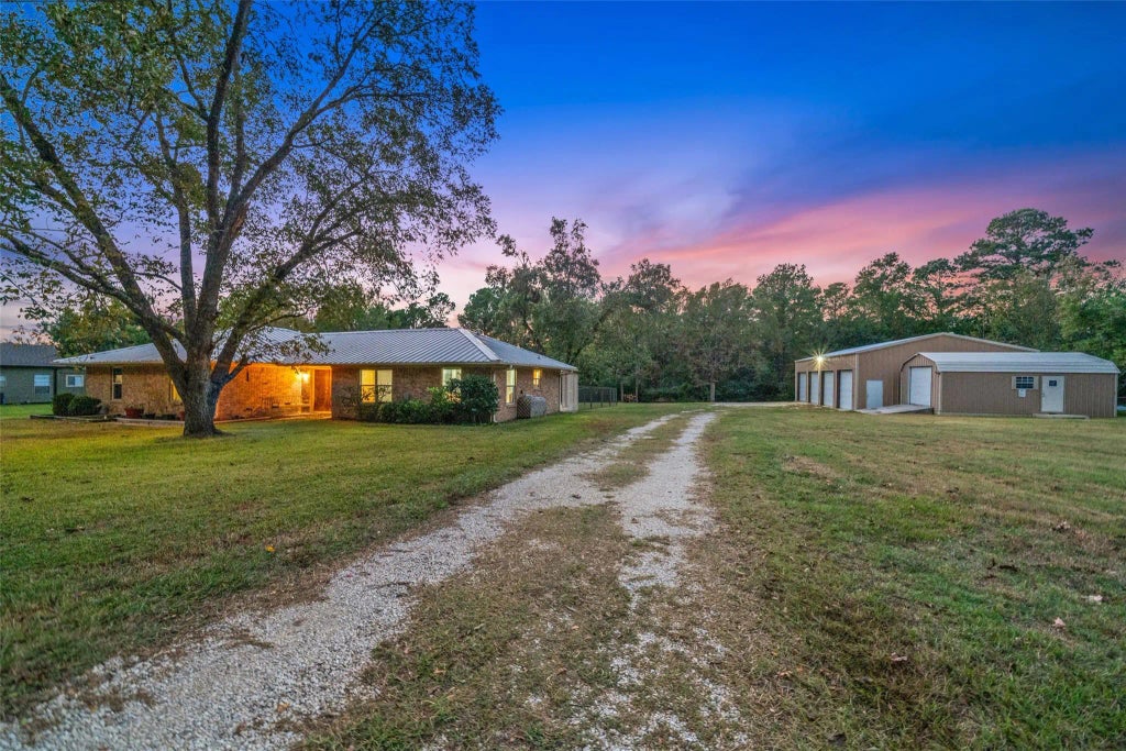 One-story brick home with 4 beds, flex room and 3 baths, situated on over an acre including wooded lots behind, located just down the street from Lake Livingston! Unrestricted property with no HOA. Includes large, detached workshop/garage with electric, water, car lift and four bay doors. Home boasts generous living room with cozy fireplace, formal dining area and kitchen with breakfast bar, SS appliances and flowing into the breakfast room. Primary suite features ensuite bath w/double sinks and walk-in shower. Two secondary bedrooms share convenient Jack-and-Jill bath, while the 4th bedroom offers its own full bath. Outside enjoy covered deck, pool, Generac whole-home generator, fenced backyard, storage shed and additional covered area for storage. Plumbed with PEX and has leaf guard filters on home & shop. Close to town and walking distance to school, this property offers so many options; residential, rental or even commercial. Enjoy the quiet setting, privacy and endless potential.