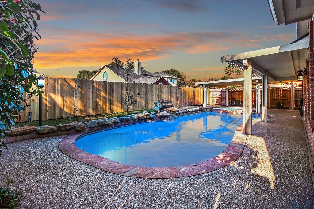 GREAT LOCATION! Gorgeous home w/POOL & SPA! Stunning entryway offers lots of natural light as you enter into the Dining, Living and/or Flex rooms. Wood look tile floors throughout-NO Carpet! Home features 4 bedrooms and 2 full bathrooms. 4th bedroom can easily be used as a Study/Office. OPEN CONCEPT Kitchen is perfect for gatherings and has a large custom ISLAND with stainless steel appliances. Granite countertops accentuate the long breakfast bar with space for extra seating. LARGE primary bedroom is tucked away and has a beautiful brick like accent wall and large ensuite bathroom connected. Relax on the extended covered back patio that offers endless opportunity to entertain by the POOL! Home is nice & clean, Light & Bright w/ 2 natural skylights! Walking distance to neighborhood park, pool and amenities. Great LOCATION with easy access to Grand Parkway and I-10. Zoned to award winning Katy ISD schools. Washer, dryer and refrigerator included. Call today!