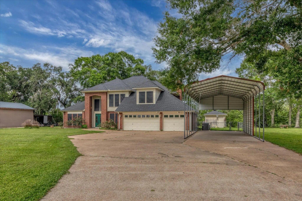 Discover this spacious 3,196 sqft home nestled on just under an acre of riverfront property, offering 166 feet of water frontage with serene views and endless outdoor opportunities. This home features 3/4bedrooms, 2 and 1/2 bathrooms that are spacious and thoughtfully designed for comfort. A versatile flex room, 2 living rooms, a breakfast area, with a separate dining room option. The kitchen has granite counter tops and a gas cooktop with 2 wall ovens for the home chef. Travertine jacuzzi tub in the primary bath for a spa-like retreat after a long day. Three car garage and a large carport ideal for boats, RV or additional vehicles. Entire reroof in 2023, water well tank in 2025, and two HVAC's in 2023. Per the owner this property has never flooded.