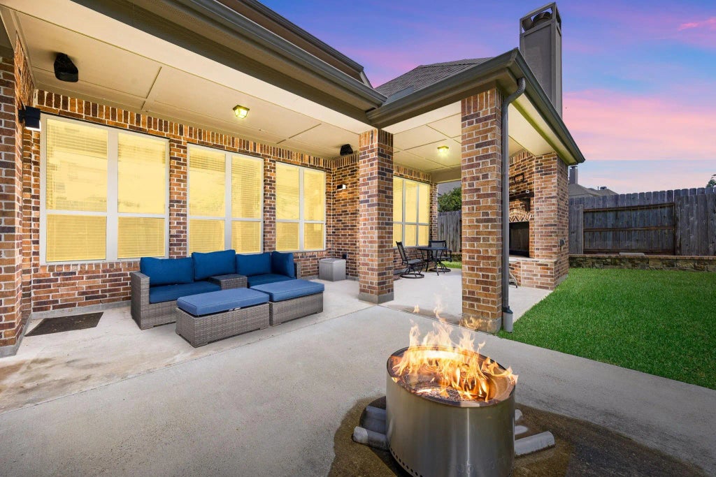 This stunning home blends elegance, functionality, and comfort at every turn! The welcoming entry leads to rich hardwood floors that flow through both formal living areas, the study, den, and kitchen. With two bedrooms on the main floor, including a primary suite designed for royalty, you'll love the spa-inspired bathroom complete with an oversized “car wash” style shower. The gourmet kitchen is a showstopper—featuring a massive island, stainless steel appliances, and a spacious butler’s pantry, perfect for everyday living or entertaining. Upstairs, you'll find three more bedrooms with walk-in closets, a large game room, and a dedicated theatre room. Step outside to your covered patio with fireplace and built-in surround sound—ideal for gatherings or quiet evenings. And with a whole-house generator and surround sound in the den and patio, this home checks every box for luxury and peace of mind. Move-in ready and never flooded!