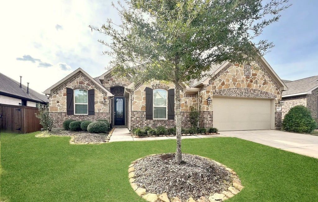 Wow, check out this move-in-ready, single-story home in master planned Meridiana featuring 4 bedrooms, 2.5 baths, and split floor plan. The spacious kitchen has granite countertops, a large island with breakfast bar, walk-in pantry, and under-cabinet lighting—open to the living area with a cozy corner fireplace. Two dining areas offer flexibility. The primary suite includes dual vanities, soaking tub, separate shower with seat, and a generous walk-in closet. A built-in work center off the kitchen adds convenience. Additional features include: hickory hardwood floors, designer tile, crown molding, ceiling fans, 16 SEER HVAC, gutters, and sprinkler system. Relax on the oversized 27'x9' covered back patio overlooking the large backyard. Zoned to Alvin ISD and just minutes from 288—don't miss your chance to call this home!