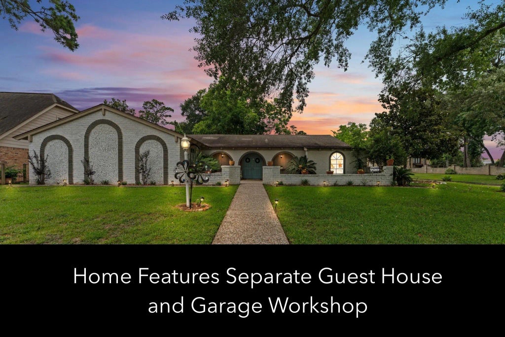 Spacious 5 bedroom home with GUEST HOUSE & workshop garage on a CORNER LOT! Soaring ceilings in the large living area, a dedicated office/flex space, and a gameroom! Dining room includes a brick accent wall and built-in wet bar! Kitchen boasts white cabinetry & stainless steel appliances. Spacious laundry room features built-in cabinets & utility sink! Primary retreat features wood beams, sliding glass door, & private en-suite with huge walk-in shower. The four bedrooms in the main house are generously sized. Garage has been transformed into a fully functional workshop; tools and equipment available for purchase! Private guest house includes a living area, bedroom, kitchenette, and full bath - great for visitors, working from home, or multigenerational living. Just minutes from Lemm Elementary & Forest Oaks Park with trails, playground, and a serene pond. Optional racquet club membership includes access to a large pool. A must-see home with space, charm, and versatility!