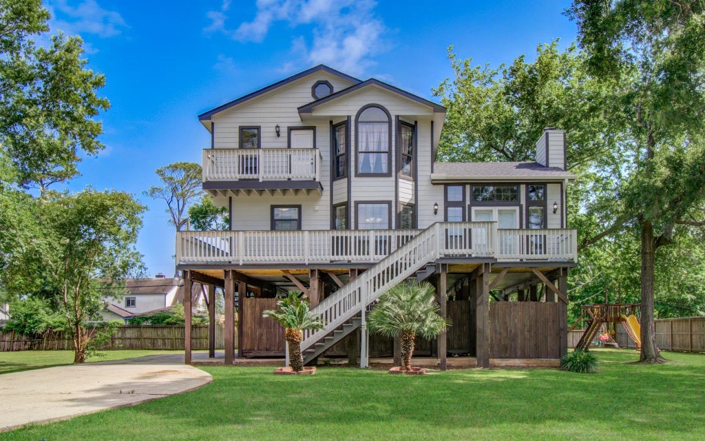 Modern 3-bedroom, 2.5-bath home on a spacious 13,000 sq ft lot in Shoreacres. This 2-story property features a large upstairs primary suite, open living/dining layout, and updated vinyl plank/tile flooring. Enjoy outdoor living with a covered patio, balcony, and porch. Includes central electric cooling, central gas heating, wood-burning fireplace, and gas appliances. No HOA!