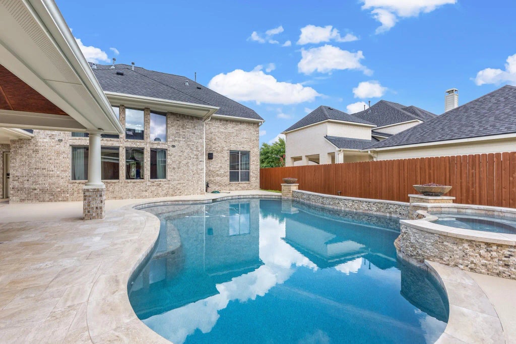 ENJOY a RESORT-STYLE Backyard with MASSIVE pool and heated spa, gas fire torches, covered area, wall-mounted tv, and half bathroom. OVERSIZED three-car garage with motorized gate. Cul-de-sac street, within walking distance from Griffin Elementary and Beckendorff Junior High. Quick access to walking trails, shopping, and recreation. EXECUTIVE styling features include 8' double entry doors, two-story ceilings, curbed stairs with wrought iron spindles. LARGE primary bedroom with fireplace, sitting area, LUXURIOUS bathroom, two walk-in closets. The second bedroom has two walk-in closets.The third bedroom has a walk-in closet and a generous desk area. The fourth bedroom has direct access to a full bathroom.There is a hidden closet in the game room. The flex room can easily be used as a media room or fifth bedroom.