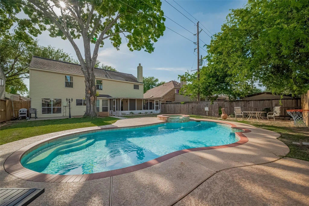 Spacious, stylish and ready for summer fun! This 4-bedroom home offers tons of flexible living space with a dedicated office, formal dining and a bright, open living room. Upstairs enjoy four roomy bedrooms including a huge primary suite set apart for privacy, plus a beautifully updated guest bathroom. No carpet anywhere! Downstairs you'll find tile and laminate flooring while the upstairs has been recently upgraded with sleek vinyl plank throughout. Step outside to your dream backyard - an oversized gas heated pool, hot tub, massive concrete deck around the pool and back of the home offer lots of space for furniture and bbq space! The screened in porch is a massive perk here! No backyard neighbors here - just peaceful green space ideal for evening strolls with the family and pups. Call today to see this wonderful home in the heart of Pecan Grove! Low taxes and HOA fees!
