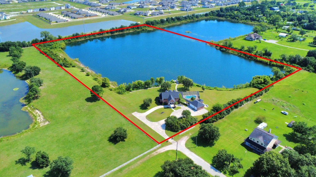 One of a kind picturesque Texas ranchette on over 15 acres with an additional 13 acres available next door. Located at the end of the cul-de-sac this custom built home showcases the best of Texas living. Peace & privacy with a close commute to Houston, Pearland, Galveston & more. Home backs up to a private lake which the seller believes is spring fed due to crystal clear water & consistent water level. The roughly 22 acre rock banked stocked lake is shared with one neighbor. The home features 4/5 beds, 5 full baths, office, game room, formal dining room, living room w/ breakfast area, a large backyard covered patio. Screened swimming pool, floating dock/pier on the lake, 3 car oversized garage, about 3 acres of yard, marble tile, high ceilings, primary bedroom on 1st floor, huge driveway w/ extra parking for RV. Fully fenced 13 acre lot next door has a smaller pond, about 11 acre pasture with a 4 stall horse barn. Both properties have high elevations putting them out of the flood zone.
