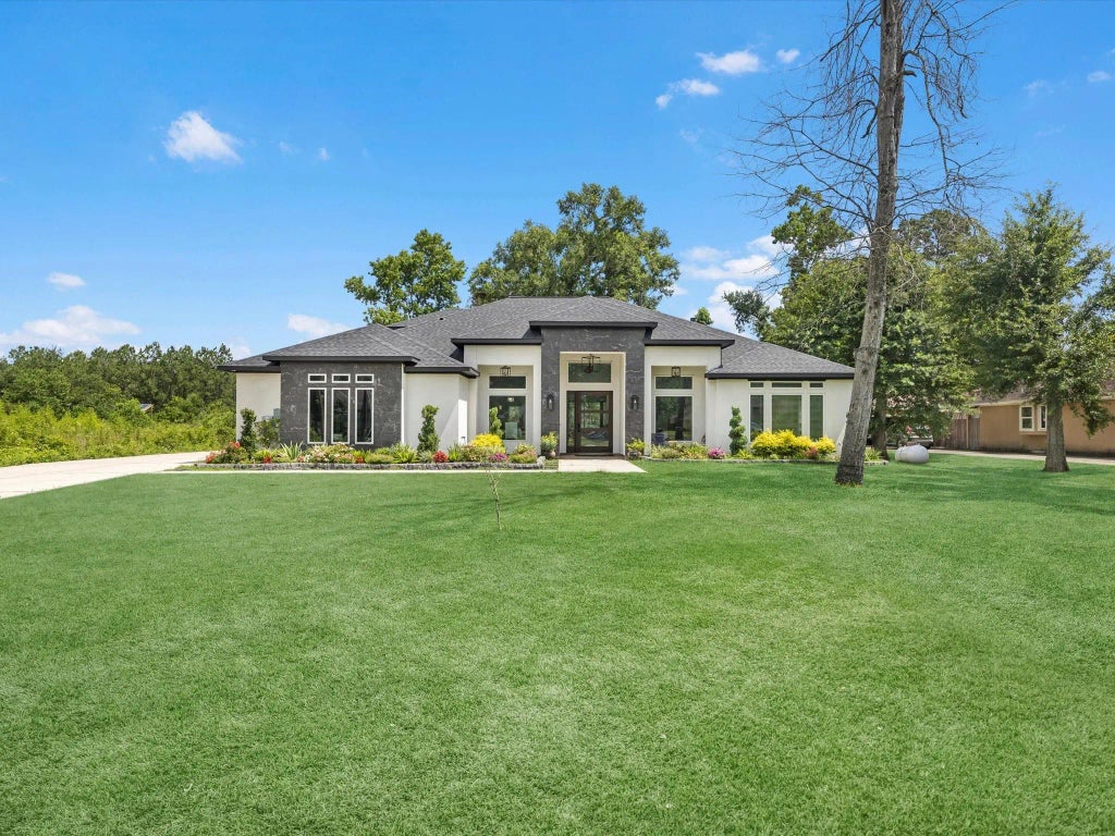 Welcome to your dream home! This gorgeous Home sits on a 1.01-acre waterfront lot, combining style and comfort. The exterior features a charming stucco mix, giving it a modern yet timeless feel. Inside, you'll love the open-concept kitchen that flows effortlessly into the family room—perfect for cozy gatherings or entertaining friends. High ceilings throughout the house give it a bright and airy feeling. The flooring seamlessly blends tile and carpet.
