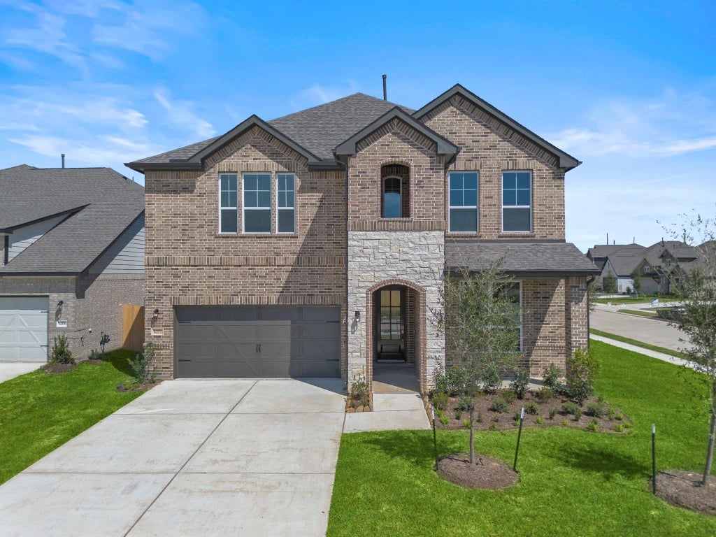 Welcome to this beautifully crafted Cypress II plan by HistoryMaker Homes, located on a corner lot in the master-planned community of Katy Lakes. This two-story boasts an open-concept design with 10-foot ceilings downstairs, a vaulted 20-foot ceiling in the living room, & modern touches throughout. Enjoy a chef-inspired kitchen with built-in stainless appliances & luxury vinyl plank flooring that flows through the kitchen, living, nook, & home office with French doors. The downstairs primary suite is a true retreat, featuring a garden tub, separate shower, & double vanity. Upstairs offers a spacious game room, three well-appointed secondary bedrooms, & two bathrooms, one of which has convenient joint access to two of the bedrooms. Step outside to your extended covered patio, complete with an exterior gas line for a future outdoor kitchen, perfect for entertaining. Full gutters, sod, & irrigation included. On a 55'x123' corner homesite, this home combines comfort, style, & smart design.