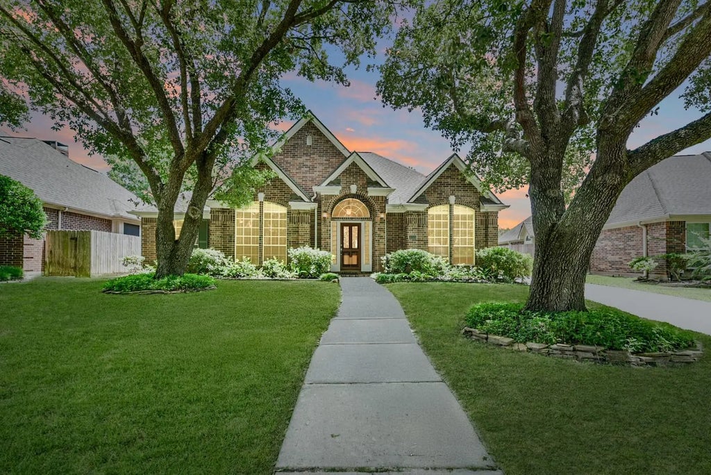 Interior freshly painted white 8/21! Nestled on a quiet culdesac street in the heart of highly desirable Green Trails, this 1-story GEM features an open-concept & split floorplan w/luxurious modern finishes! Breathtaking front elevation w/mature Oaks & professional landscaping welcomes you home! Dramatic entry greets you w/gorgeous Oak hardwood floors & elevated ceilings w/flanking formal den/study & dining room w/extensive crown molding & wainscoting! Spacious family room w/gas fireplace is filled w/natural light & seamlessly flows into the Gourmet Chef's island kitchen w/exquisite marble countertops w/extended breakfast bar, painted cabinetry, tile backsplash, & stainless steel appliances! Private master w/direct patio access & extended sitting area w/bay windows & plantation shutters offers an en suite bath w/dual marble vanities, separate shower & jetted tub, & HUGE walk-in closet! Two additional bedrooms w/shared bath! Oversized private backyard w/extended patio & greenspace!