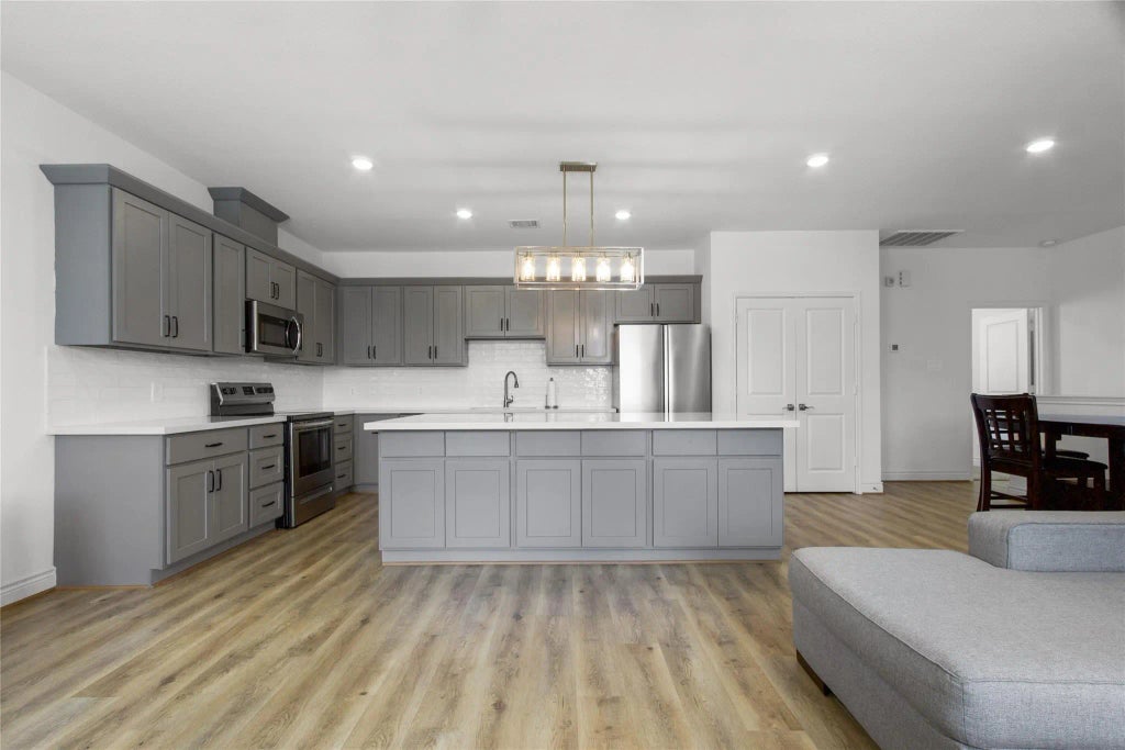 Modern style meets comfort in this beautifully designed 3-bedroom, 2.5-bath home located just minutes from downtown Houston. This partially furnished home features an open-concept living space with sleek finishes, wood-look floors, and abundant natural light. The spacious kitchen boasts quartz countertops, a large island with custom gray cabinetry, stainless steel appliances, and modern lighting. Upstairs, the primary suite offers a peaceful retreat with a private balcony, walk-in closet, and a spa-like en-suite bath. The two additional bedrooms provide flexibility for guests, a home office, or personal space. Enjoy the convenience of an attached two-car garage, low-maintenance yard, and no HOA. Ideal for homeowners or investors seeking a move-in ready opportunity in a rapidly developing area. Professional Photos are on the Way! But why wait? Schedule a tour today.