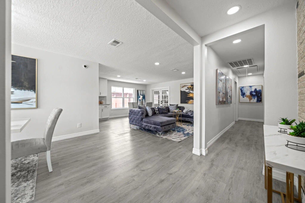 Welcome home to this beautifully remodeled gem! This home has been completely transformed from the inside out with thoughtful attention to detail. Step inside to find premium luxury laminate flooring and a cohesive black, white, and gray color palette that flows throughout. Each bathroom features elegant new granite countertops, and the entire home is fitted with energy-efficient vinyl windows for added comfort and savings. The open-concept kitchen shines with stainless steel appliances—including a refrigerator—modern octagon-pattern backsplash, and cabinetry. Fresh paint, abundant natural light from the skylight ceiling, and a tankless water heater make this home truly move-in ready. An added bonus room with a window unit provides the perfect space for gatherings or events. Outside, enjoy relaxing evenings in your spacious backyard with an extended patio and brand-new wood fencing. Security cameras are also installed around the property for peace of mind.
