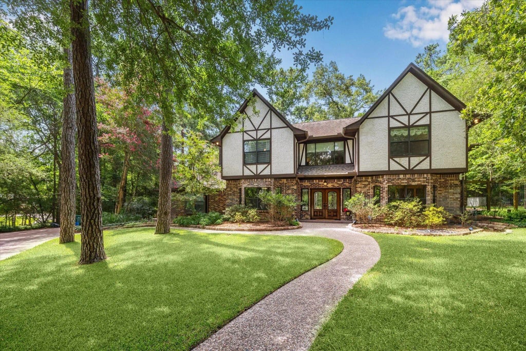 Welcome to your private retreat in highly sought-after Willowridge Estates! Nearly 1.5 acres of peaceful land teeming with deer, ducks, birds, and bunnies. The like-new Gunite pool with spa is paired with a pool house featuring a full bath. Drive up on a showstopping brick-paved driveway with extra parking. This custom solid home is built with cedar, full stucco and brick, 50-year roof, Low-E insulated windows, whole-house vacuum, and a high-efficiency HVAC system. A gas-powered Generac generator and geothermal system provide year-round comfort. The kitchen offers new quartz countertops, new refrigerator, and a charming wet/coffee bar. The atrium with a grand staircase, arches, and natural light adds style. Enjoy a covered patio and a private upstairs terrace off the primary suite overlooking apple and pecan trees. Includes shop, shed, city water/sewer, well and rain barrels for lawn. Low tax rate, Conroe ISD, close to shopping, dining, and everyday conveniences. Priced to sell!