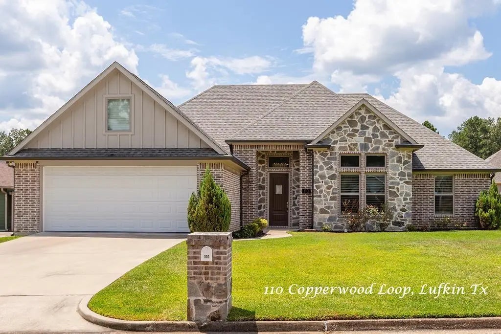 Modern Elegance in Lufkin's South Bend Subdivision! This stunning 4 Bedroom, 2 Bath brick home features tall and boxed ceilings throughout, an open-concept, split floor plan, and a wood-burning fireplace with gas starter in the living area! The well designed modern kitchen features a gorgeous island, breakfast bar, leather-finish granite, black hardware, tiled backsplash, walk-in pantry, and abundant cabinet and counter space! It also includes modern lighting and beautiful tile floors throughout with absolutely no carpet! The spacious primary suite offers a spa-like bath with a custom tile shower, soaking tub, and double sinks. Additional highlights include custom Plantation shutters and custom shades, a tankless water heater, air-conditioned attic storage, covered front porch and back patio, landscaped yard with sprinkler system, energy-efficient windows, and a double attached garage. Smart features include a Nest thermostat with 3 sensors, Ring doorbell, and built-in USB chargers!