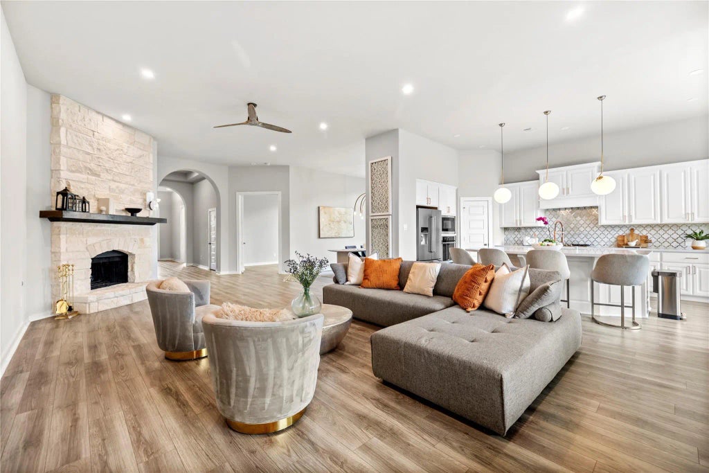 Welcome to this beautifully designed one-story home offering the perfect combination of space, comfort, and modern style. The home consists of 4 beds, 3 baths, a dedicated home office, breakfast area, formal dining and a spacious living room. A stunning open-concept kitchen w/ a large center island features modern tile backsplash, built-in SS appliances, and plenty of cabinet space. The kitchen opens to a spacious living room w/ a cozy fireplace, creating a warm and welcoming atmosphere. The primary suite offers a private sitting area, walk-in closet, and spa-like bath w/ double vanities, soaking tub, and walk-in shower. Step outside to the extended covered patio, ideal for outdoor dining, relaxing, or hosting guests. The backyard space is perfect for weekend barbecues, or family gatherings. The home also includes a whole-house water softener system, adding comfort and efficiency to your daily routine. Don't miss out this beautiful home w/ a rare, open floor plan!