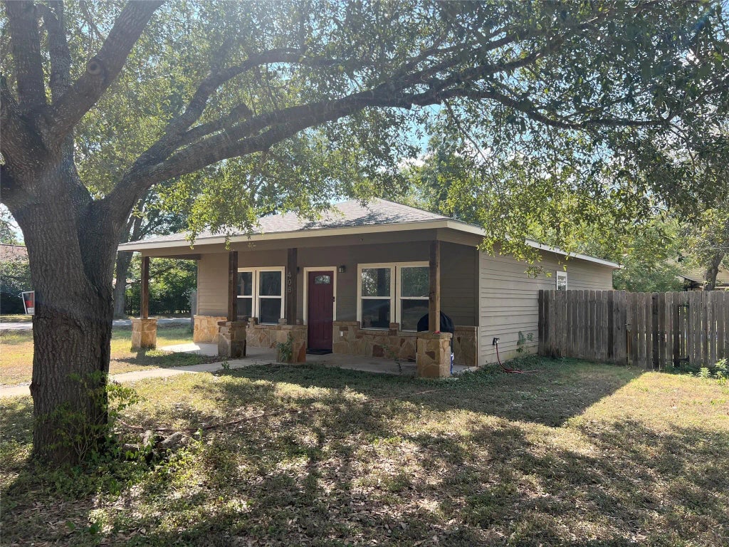 This 3 bedroom, 2 bath home sits on a large corner lot with fenced back yard and a welcoming covered front porch that extends the entire width of the home. Built in 2016, this nice family home features an open kitchen/dining/living floor plan with high ceilings. The master suite has a coffered ceiling, tiled tub/shower combo and walk-in closet. The secondary bathroom is conveniently located between the other 2 bedrooms. The entire home has stained concrete floors which not only reduces the allergens entering the home but is low maintenance. The stackable washer/dryer combo will remain in the home and convey to the new buyer. A large concrete drive was added behind the home with access off the drive-thru alley which provides additional parking, a family play area or the perfect grilling spot for those get-togethers with friends and family. This property is located less than a mile from MLK Park and the Little League fields and a short drive to Bastrop or La Grange.