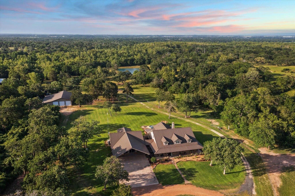Luxury Ranch Estate on 43+ Acres – Custom Home, Guest House, Equestrian Amenities & More! Just a 45-minute drive from Katy. 43.66 fenced acres of scenic countryside, this one-of-a-kind 6,633 sq ft custom steel-frame home combines luxury living with ranch functionality. Built in 2016, the open floor plan offers 4 spacious bedrooms and 4.5 baths, with all bedrooms conveniently located downstairs. Enjoy a fully equipped game room and media room upstairs, perfect for entertaining family and friends. Step outside and experience resort-style living with a sparkling pool and hot tub, all overlooking a peaceful pond view framed by mature trees. The outdoor space also includes: 4-car garage + 4-car carport 1-bed, 1-bath guest house 1,200 sq ft mancave above the garage 8-stall horse barn with lighted riding arena 50x80 insulated shop with a 25x80 lean-to Don’t miss the opportunity to own this exceptional ranch estate. Schedule your private tour today!
