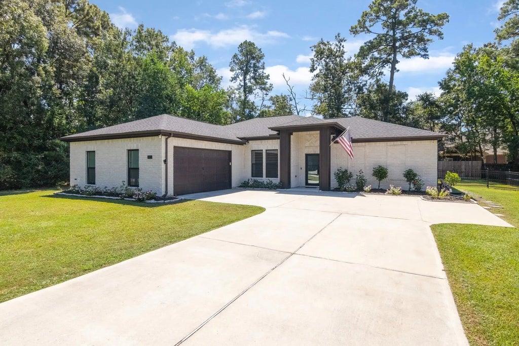 Large lot with low tax rate and space to build a shop. Updated 3-bedroom, 2-bath home with open-concept layout and modern upgrades. Kitchen features butcher block and hard-surface countertops, pot filler, electric range, and extended soft-close cabinetry. Enjoy custom blinds, accent lighting, smart home controls, surge protector, generator connector, and wired security with 4 cameras. Luxurious primary suite offers spa-like bath with soaking tub, freestanding shower, dual sinks, and patio access. Oversized garage with epoxy floors, storage, and mudroom. Covered patio, new sod, and fenced yard. Fully bricked exterior with gutters and leaf guards. Community amenities include clubhouse, park, and private Lake Houston boat ramp. Rural feel with modern convenience!