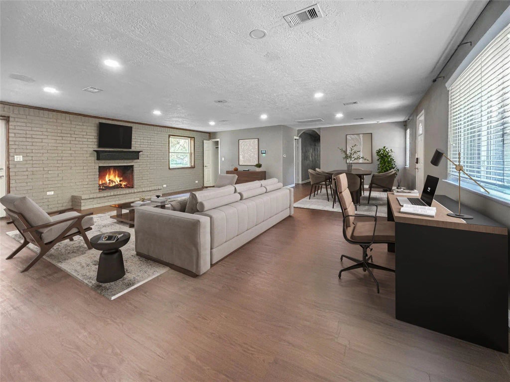 Welcome to this beautiful, move-in ready home offering the perfect blend of comfort, charm, and convenience! Ideally located near parks, shopping, and dining, this spacious residence features gleaming floors and an abundance of natural light throughout. The main living room is warm and inviting with a stunning floor-to-ceiling brick fireplace and walls of windows that fill the space with sunlight. The kitchen is a dream for any home chef, boasting ample cabinet and counter space, stainless steel appliances, a large island, and room for both a cozy breakfast nook and a formal dining area. Each bedroom offers generous space and comfort, making it easy to create restful retreats. Outside, you'll find over half an acre of fully fenced yard space, offering both privacy and room to play. A covered patio provides the ideal setting for outdoor dining or simply relaxing in the shade. With a rare 3-car garage and plenty of room to spread out inside and out, this home truly has it all!