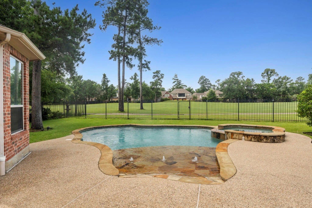 Fully Furnished - This beautifully maintained home offers 4 bedrooms and 3.5 baths in a sought-after location. Walk to school or enjoy the nearby golf course. The spacious layout includes an open-concept living area, a gourmet kitchen with granite countertops, and a bright, airy dining space. The primary suite features a large walk-in closet and a luxurious bath. Additional highlights include a three-car garage, generous closets throughout, and an impressive two-story office and library. Outdoors, you’ll find a sparkling pool, a built-in kitchenette perfect for entertaining, and stunning views of the Gary Player golf course. Fully furnished and move-in ready — ideal for those seeking stylish living without the commitment of buying.