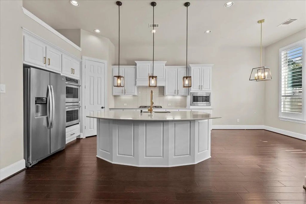 This exquisite home features crown molding, plantation shutters, hardwood floors, fresh designer paint, and elegant lighting throughout. The heart of the home is a cozy open-concept kitchen, living, and dining combo, complete with gas cooktop, double oven, and abundant cabinetry. The private primary retreat offers double sinks, oversized vanity, spa-like tub, separate shower, and a massive walk-in closet. A second downstairs primary adds versatility, while all bedrooms feature walk-in closets. Upstairs, a spacious media/game room can serve as a sixth bedroom. Enjoy outdoor entertaining on the covered patio surrounded by lush landscaping. With an EV charger in the garage and just minutes from top schools, H-E-B, parks, trails, fine dining, and I-45, this meticulously maintained residence truly has everything you need and more—luxury, comfort, and lifestyle in one.