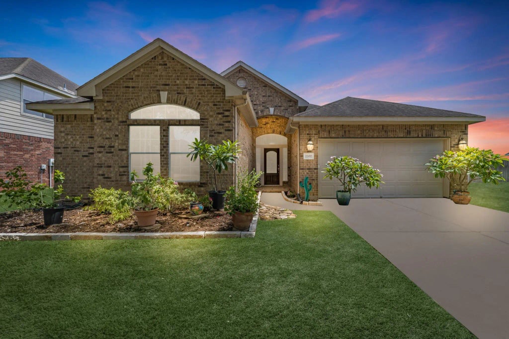 Welcome to this beautifully maintained single-story home offering 4 spacious bedrooms, 2 full baths, and serene water views from the kitchen, living room, and primary suite. Step inside to a warm and inviting foyer with soaring ceilings that carry throughout the home, creating an open and airy feel. Enjoy low-maintenance living with engineered hardwood and ceramic tile—no carpet anywhere. The open-concept layout is perfect for entertaining, featuring a generous living area with a cozy corner gas fireplace and a wall of windows that frame the peaceful water view. The kitchen boasts granite countertops, a breakfast bar height island, 42” upper cabinets, and a sunny breakfast nook. A formal dining room offers additional space for hosting gatherings. Retreat to the spacious primary suite with water views and an en-suite bath designed for relaxation. Step out onto your covered patio, perfectly shaded in the afternoons—ideal for quiet evenings or entertaining guests outdoors. A tranquil gem!