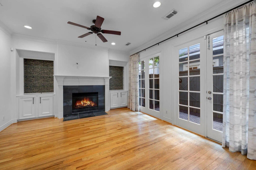 Enjoy privacy and peace of mind in this beautifully three-story home, nestled in a desirable gated community. Bright and airy with high ceilings, hardwood floors, crown molding, and large windows, the main level features elegant formal living and dining areas. The kitchen shines with granite countertops and stainless steel appliances, flowing into a warm family room with built-in shelves. The spacious primary suite offers a luxurious bath with double vanities, soaking tub, shower, and dual walk-in closets. Two bedrooms share a Jack and Jill bath, while the top-floor guest suite includes a private en-suite—perfect for visitors or a home office. Relax on the charming back patio or enjoy the convenience of a two-car garage, extra parking, new ducts, and attic insulation. All just minutes from the Houston Med Center, Downtown, and more—this is gated community living at its best.