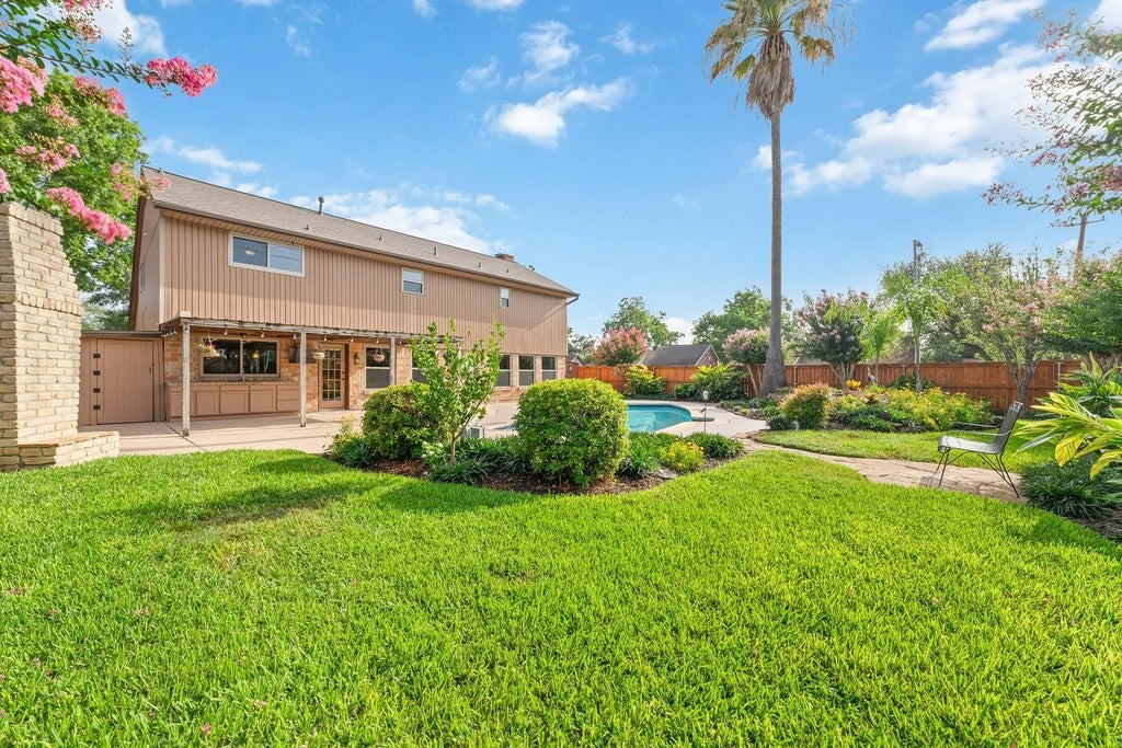 Your tropical paradise awaits! Well-maintained Perry home on a large corner lot with a private backyard retreat featuring a gunite pool, waterfall pond, and extended patio with lighting, outdoor fireplace, and built-in cabinets with sink. Major system updates include a recent roof (Jan 2025), Trane A/C (2021), water heater (2023), and double-pane windows (2017, with transferable warranty). The garage offers epoxy floors, built-in shelving, and an extended driveway added in 2025. Inside you’ll find double ovens, indoor utility room with gas hookups, gas fireplace, wet bar, and surround sound. Flooring includes ceramic tile, wood/marble stairs, and bedroom carpet replaced (Dec 2020). Additional features: 2 attic spaces (one walk-in), Rainbird front/back sprinkler system, fruit trees, keyless locks, and Ring doorbell. Never flooded (per seller). Fridge w/ ice maker stays. Zoned to Pasadena ISD with low HOA and tax rate. This one checks all the boxes—schedule your tour today!