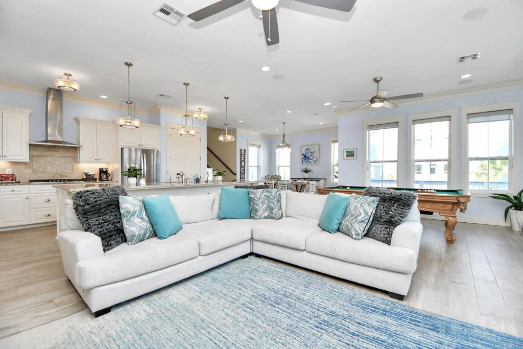 Situated in the exclusive Beachside Village neighborhood, this pristine home brims with upgrades and luxury finishes. Set on a prime corner lot with no adjacent neighbors, it boasts multiple balconies, four majestic Mexican palms, and breathtaking sunset views. Catch the elevator up to the chef-inspired kitchen including a vast 13-foot island, a gas cooktop, custom soft-close cabinetry, and exotic granite countertops. Ideal for gatherings, the open living area features a 36" direct vent gas fireplace, porcelain tile plank flooring and double crown molding. From the living room, step outside and enjoy views from every angle on the expansive wraparound porch. The spacious top-floor primary suite includes a private porch for sunrise views. This home is also equipped with an outdoor shower and workshop, 22KW Generac generator, two tankless water heaters, a finished attic for storage, and a reverse osmosis water system. This coastal haven has everything and more.