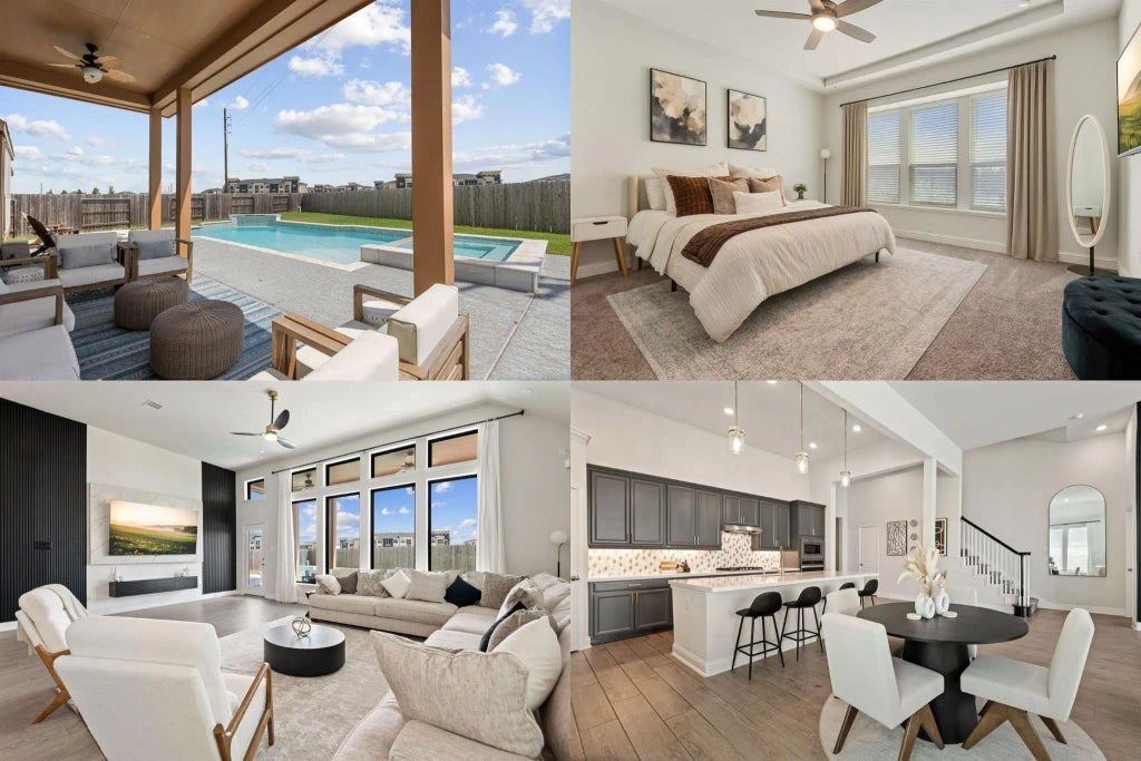 Welcome to your dream home in the sought-after Young Ranch community! This stunning residence showcases an open floor plan with soaring ceilings and abundant natural light. The gourmet kitchen is the heart of the home, featuring quartz countertops, stainless steel appliances, mosaic backsplash, and chic pendant lighting. The spacious owner’s suite offers a spa-like retreat with double vanities, soaking tub, and separate shower. Upstairs, enjoy a versatile loft, fifth bedroom, and full bath—ideal for guests or family. Step outside to your own backyard oasis complete with a covered patio and sparkling pool, perfect for both entertaining and quiet relaxation. With quick access to I-10 and the Grand Parkway, commuting is a breeze. Community amenities include a resort-style recreation center, fitness facilities, swimming pool, splash pad, scenic lakes, and playgrounds—everything you need for an active lifestyle.