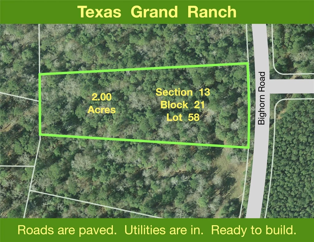 2.00 ACRES > ON A QUIET LOOP > 186' FRONTAGE >TERRAIN GENTLY SLOPES DOWN FROM THE ROAD > SEASONAL CREEK ON THE VERY BACK LINE > Ready for peace & quiet & privacy? Ready to build. Start building whenever you want. Choose your own builder. EZ access to I-45. Texas Grand Ranch is a large lot, wooded community in the rolling hills. Country lifestyle for your custom forever home. Mature trees, paved roads, water & HIGH SPEED fiber optic internet. Covered pavilions, parks, ponds, playgrounds, BBQ areas. Minutes from shopping, dining, schools, hospitals, and entertainment. Low taxes - No MUD tax. HIGH & DRY - Average elevation is 325’ ASL. Surrounded by Nat’l Forest (161,508 acres) & State Park (2,083 acres) with 100’s of miles of hiking, biking and horseback riding – boat launches & beaches. Come home to Texas Grand Ranch.
