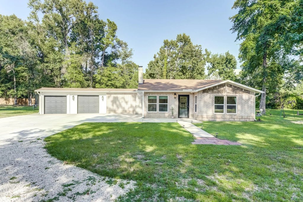 Welcome to this beautifully upgraded 1-story retreat on 2.2 acres (2 lots included), offering 2 bedrooms, 2 baths, study, and large utility/bonus room. The open kitchen boasts granite countertops, tile backsplash, and a seamless flow into the living room, perfect for gatherings, where you can also see the charming wood-burning fireplace in the dining room. Relax in the primary suite featuring a generous walk-in closet and shower, while the second bath offers both tub and shower. Enjoy the expansive backyard with RV connections, 50-amp service, sprinkler system, and abundant wildlife. The property includes a powered entry gate, expanded driveway, and security system for peace of mind. Enjoy a serene country lifestyle while still being just minutes from New Caney’s shopping, dining, and easy highway access, a perfect blend of rural charm and modern convenience. The spacious grounds are perfect for adding a pool, planting a garden, or simply relaxing in your quiet, scenic surroundings.