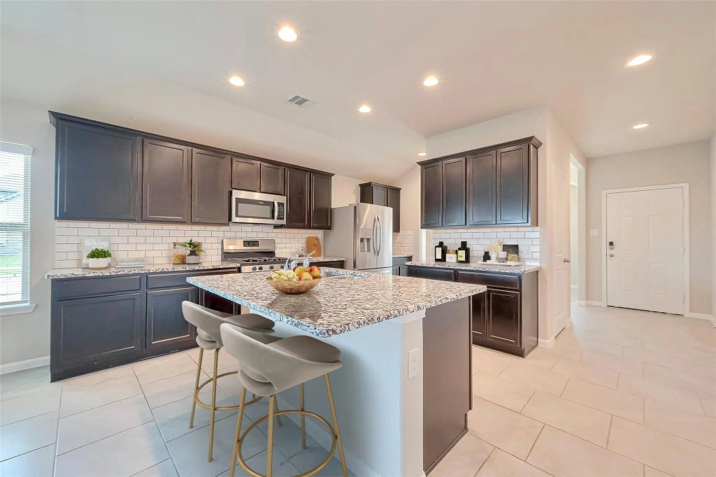 This home was freshly painted and newly installed luxury vinyl planks in summer 2024 in all bedrooms. 3 bedrooms, 2 bathrooms single-story, sits on a corner lot with great curb appeal and perfect to call home. Home offers an open floor plan with staggered tiles from front to back door, formal dining along with a fully upgraded kitchen that opens up to the living room and comes with 42" wood cabinets, granite countertops, SS appliances, gleaming white subway tile backsplash, along with kitchen island. All bedrooms have brand new luxury vinyl planks and come with ceiling fans. Digital thermostats and pre-wired with a digital keypad for alarm. Comes with brand new SS refrigerator, washer and dryer, mini-blinds, backyard sod, gutters, and tankless water heater which means you will never run out of hot water! Entertain in the spacious backyard with a covered patio. Enjoy the amenities of Tamarron parks, resort style pool and splash pad, walking trails, lakes and more.