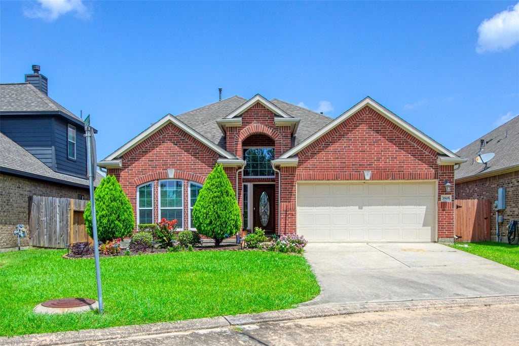 Welcome to 3505 Firenze Drive, a beautifully maintained 4-bedroom, 3-bathroom home offering 2,851 sq ft of living space in the gated Terra Bella community of Friendswood. Built in 2015, this two-story home pairs thoughtful design with modern comfort. Inside, you’ll find an open-concept living area anchored by a gas-log fireplace, plus a flex room with French doors—ideal for a home office or playroom. The first floor features two bedrooms, including the primary suite with dual vanities, a soaking tub, separate shower, and a walk-in closet. Upstairs, enjoy a spacious game room, built-in study nook, and two additional bedrooms with a full bath—great for guests or kids needing their own space. Outside, the covered patio and fenced backyard create a private outdoor retreat. With a 2-car garage, low-maintenance design, and easy access to I-45, shopping, and dining, this home delivers everyday comfort in a quiet, convenient Friendswood location.