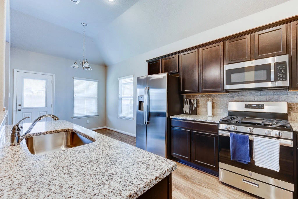 Experience timeless charm and modern comfort in this stunning home featuring a natural brick and stone exterior. Step inside to an open-concept floor plan that seamlessly blends living, dining, and kitchen areas—perfect for entertaining. The kitchen is a chef’s dream with granite countertops, a stylish tile backsplash, and ample cabinetry. The spacious primary suite offers a serene retreat with double sinks, a separate vanity, and generous storage. Durable vinyl flooring throughout adds elegance and ease of maintenance. Energy efficiency is enhanced by the TechShield radiant barrier. Enjoy peaceful mornings or relaxing evenings on the covered back patio, ideal for outdoor living year-round. This home blends style, function, and comfort in every detail. Schedule a tour today!