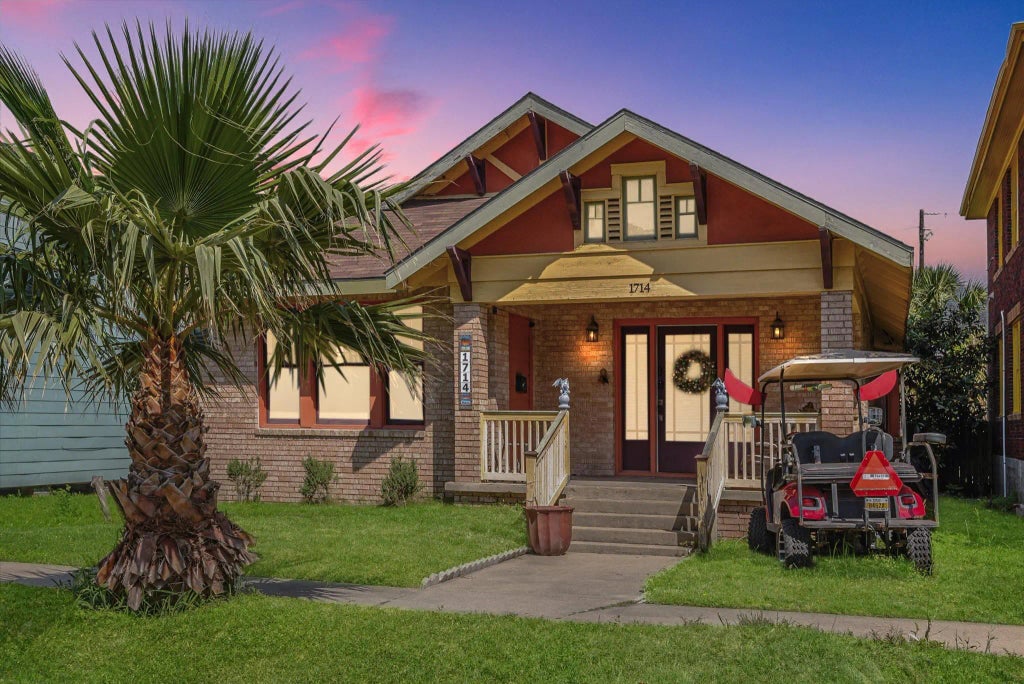 RARE and sought after one of a kind 1920s Craftsman Brick Home in Galveston’s Historic District—just a short stroll from the vibrant Strand! This one-story gem blends old-world charm with sleek upgrades, including a stunning kitchen with white cabinetry, granite countertops, stainless steel appliances, and a huge island. Solar panels help lower your bills while you enjoy the good life! The outdoor area is a Tropical Paradise that is built for entertaining! Includes a garden space framed by palm trees, an amazing palapa, a spacious slab, deck, and tiki-style bar area that brings resort vibes right to your backyard!