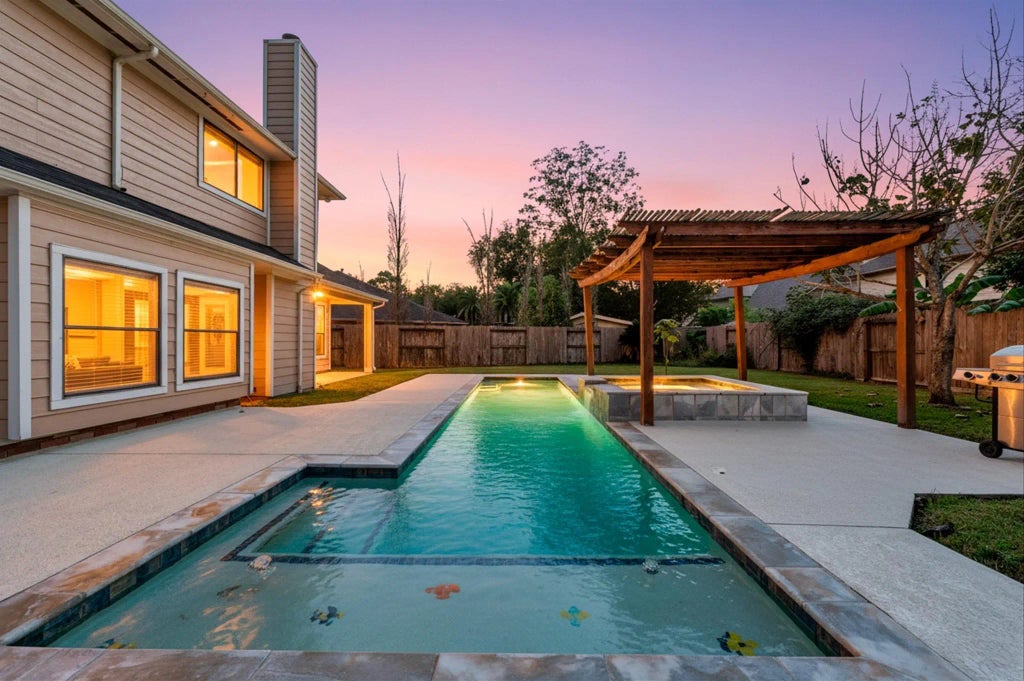 Looking for space, comfort, and a backyard made for fun? This comfortable 2-story home offers a great layout with plenty of space for all. The living room, featuring a brick hearth fireplace, opens to the breakfast room, where a cozy window seat invites morning coffee or afternoon daydreams. The kitchen has granite counters, stainless steel appliances, and a breakfast bar that overlooks the living room. There's also a formal dining room that could easily be utilized as an office or creative space. Upstairs, a game room with built-in shelves anchors the secondary bedrooms. The split floor plan offers privacy and functionality, with two secondary bedrooms and a shared hall bath on one side, and a spacious primary suite tucked away on the other. The primary bath has two walk-in closets, double sinks, a jetted tub, and a separate shower. Step outside to enjoy a pergola-covered hot tub, a glistening pool, and a large patio, perfect for a relaxing weekend or entertaining guests.