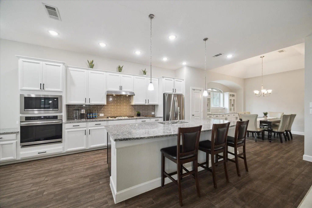 Discover this beautifully appointed single-story home designed for effortless living and entertaining, the sunlit open floor plan offers inviting, functional spaces ideal for everyday comfort and special gatherings. The chef’s kitchen is the heart of the home—featuring a massive granite island, abundant cabinetry, and an open connection to the spacious living area. A custom-built serving bar with glass-front cabinets stretches along one wall, creating a perfect setting for entertaining or casual moments. The large primary suite is complete with a serene sitting area, a generous en-suite bath, and a walk-in closet. A private guest suite with its own full bath offers flexibility for visitors or multi-generational living. Step outside to a large and private backyard. Residents of Veranda enjoy an unmatched lifestyle with access to a state-of-the-art clubhouse, fitness center, resort-style pool with waterslide, tennis courts, dog park, and miles of scenic walking trails.
