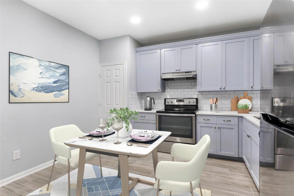 Welcome to this beautifully updated condo in Kingwood Village Estates, a gated community in the heart of Kingwood. This move-in ready home offers a modern kitchen with quartz countertops, stainless steel appliances, pantry, breakfast nook, and bar area. Cabinetry has been refreshed with Shaker-style doors, soft-close hinges, updated hardware, and new paint. Wood-look tile flooring extends through the kitchen, entry, and both bathrooms. The primary suite includes an en-suite bath with dual vanities, a renovated subway-tile shower, and sliding glass door. The secondary bath also features a modernized shower and houses the washer and dryer. Both baths showcase updated vanity mirrors. New blinds installed for a fresh finish. Ideally located on the second floor near the elevator and community amenities, this home provides convenient access to shopping, dining, medical facilities, and walking trails.