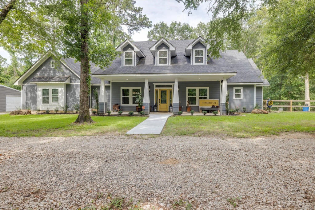Experience peaceful country living in unrestricted Northwood Country Estates. This spacious energy-efficient home sits on 2.13 acres of serene riverfront property. Private fenced backyard with covered patio to enjoy the scenic views and occasional deer. 30x30 shop with 9' roll up doors & dedicated 200-amp service. Sizable living room featuring a wall of floor to ceiling windows, luxury vinyl plank floors & custom built-ins. Sleek updated kitchen with soft close cabinets & drawers, open shelving, stainless appliances, granite counters, and walk-in pantry. Split floor plan with 4 bedrooms down, plus a huge game room with full bath, two bonus rooms or extra bedrooms, and hidden room up! Generous size primary suite with spa-like bath and must-see shower! Conveniently located near the Grand Parkway for easy access to dining, shopping & commuting. Low tax rate of 1.78% & no HOA! From fishing to target practice or working in the shop, you will love the freedom this property has to offer.