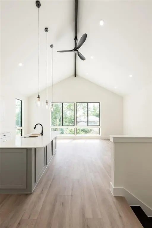Soaring 14-foot cathedral ceilings with exposed beam captivate you the moment you enter the stunning living room of this home in the gated Ocean Estates community. This 3-bedroom, 2.5-bath home offers comfort, with 10-foot ceilings throughout the rest of the home creating a open feel in every room. Two bedrooms downstairs share a stylish full bath, each with generous custom-shelved closets, and one has access to a backyard with a covered awning and low-maintenance gravel. Upstairs, the sunlit living, kitchen, and dining area features oversized windows and show-stopping cathedral ceiling. The kitchen stuns with quartz countertops, a matching backsplash, custom L-shaped cabinets, and 30” GE gas range. The primary suite includes a large walk-in closet with custom shelving, and the laundry room is conveniently nearby. High-end finishes include luxury tile, built-in shower bench & niches, and premium Delta fixtures. Community perks: gated access, guest parking, dog park, and 28-ft driveway