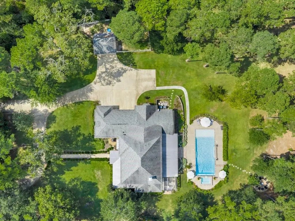 Welcome to your private retreat on 5 peaceful acres in one of Hudson ISD’s most desirable neighborhoods. This Southern Living-inspired, one-owner custom estate offers 5,073 sq. ft., 5 bedrooms, and 4.5 baths. A circle drive, manicured landscaping, boxwoods, and a 4-tier fountain create a grand first impression, while a wrap-around porch with swing sets a charming tone. Inside, French doors brighten the living spaces, including a living room with woodburning fireplace and a chef’s kitchen with ornate island, custom cabinetry, 48" Sub-Zero fridge, double ovens, warming drawer, 6-burner + griddle, and dual pantries. The downstairs primary suite boasts a spa bath with soaking tub, large walk-in shower, and dual closets, while a guest suite adds comfort. Outdoor living is unrivaled with a gunite resort pool and spa surrounded by lush tropical landscaping, expansive covered porch with multiple seating areas, full outdoor kitchen, fire pit, and a carriage house—luxury and charm combined.