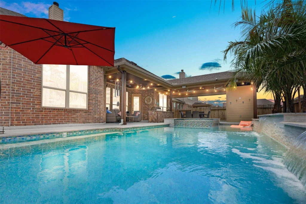 Timeless elegance with resort-style back yard! Stunning 4 BR, 3 full & 2 half bath home offers everything for comfortable living & entertaining. 3-car garage, dedicated study, game room, media room + both formal & casual dining areas. The showstopper is the backyard oasis with 2 covered patios, outdoor kitchen, tinted windows, sound system, pool/spa, pool bath, outdoor shower, artificial turf with built-in sprinklers to keep kids/pets cool + a whole home generator. Wood floors throughout (no carpet), family room with soaring ceilings & a floor-to-ceiling stone fireplace. Dedicated study with French doors for the perfect home office. The spa-like ensuite in the primary BR feels like a 5-star hotel. Upstairs offers a huge game room, multi-level theater room, 3 BR's (1 a true guest suite) & 2 full baths. Easy access to 99, 249, & 45. HOA amenities include a resort-style pool, tennis courts, trails, fishing pond & more. A MUST SEE! Floor plan attached.