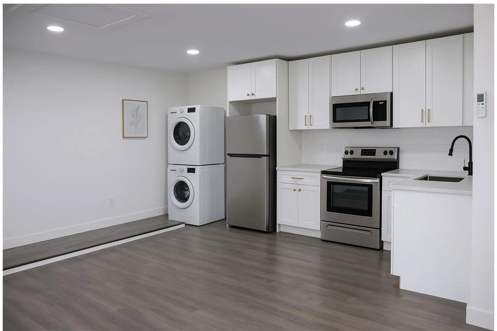 Fully remodeled garage apartment with 400 sqft of modern loft-style living. Open-concept layout with integrated areas, featuring a sleek contemporary bathroom and a spacious design ideal. Includes a kitchen with microwave and refrigerator, electric connections for washer and dryer, a window for natural light, and a small private patio.