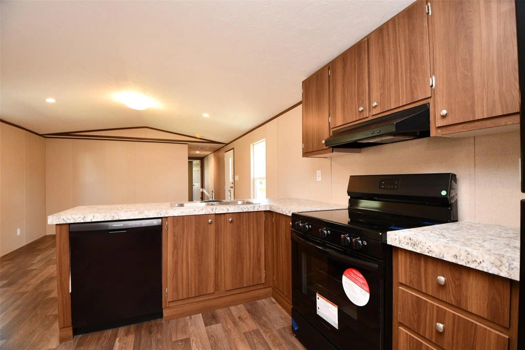Discover the charm of this well-maintained manufactured home, nestled on a spacious lot with a fully fenced yard and a picturesque mature trees offering shade and character. The home features an inviting front deck, perfect for outdoor relaxation, and a back porch for added convenience. Inside, enjoy modern living with an open-concept layout, durable wood-look flooring, and neutral finishes throughout. The kitchen boasts sleek black appliances, ample cabinetry, and a functional layout for easy meal preparation. The primary bedroom is a peaceful retreat with an ensuite bathroom featuring a combined tub and shower. This property offers an expansive outdoor retreat with a large fully fenced yard, ideal for pets, gardening, or family activities. Conveniently located near major roadways, this property combines country charm with modern convenience. Make it yours today!