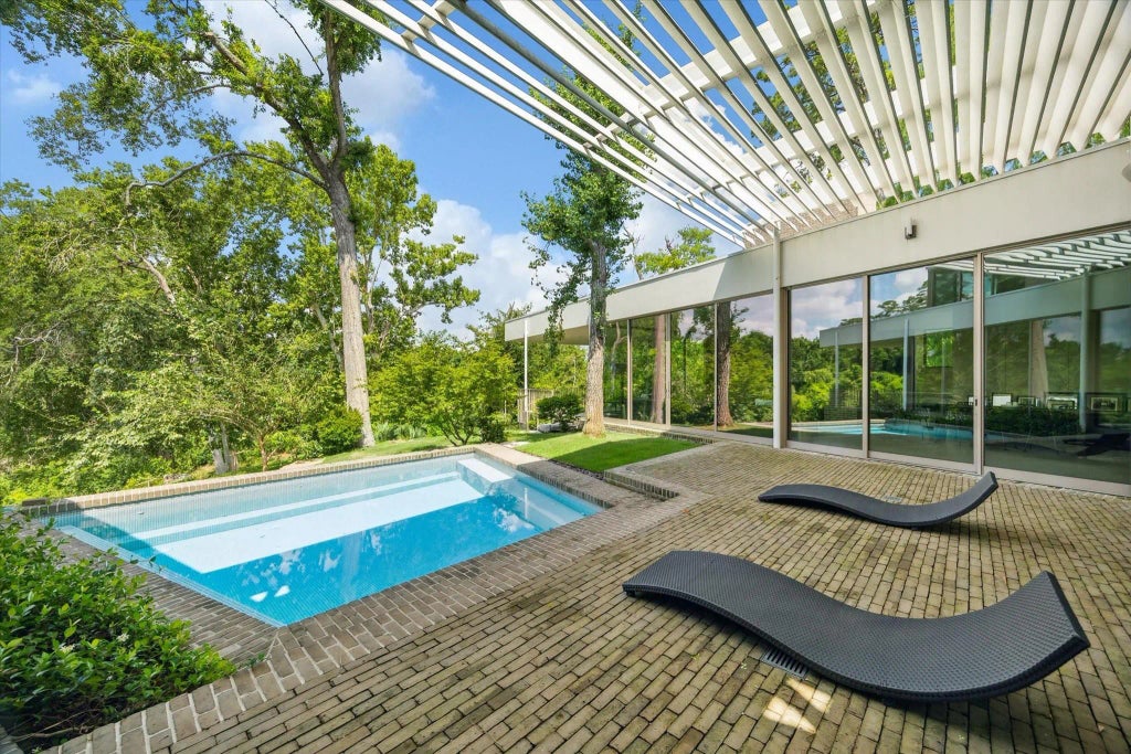 Opportunity awaits at this rare Mid-Century sanctuary tucked at the end of a cul-de-sac in prestigious River Oaks. Behind a private gated entrance, a circular drive welcomes you to this timeless 4-bedroom, 4.1-bath home. Inside, floor-to-ceiling windows showcase breathtaking panoramic views and bring the outdoors in. The open-plan design features a wet bar with copper countertops that connects to the formal dining and family rooms. A spacious island kitchen and light-filled breakfast room complete the living spaces on the first floor. The luxurious primary suite offers dual spa-inspired baths and an adjacent study for added privacy. Upstairs, three additional bedrooms share two beautifully updated marble baths. Step outside to your private retreat with a sparkling pool and scenic rolling green views. This is a rare opportunity to lease an architectural gem in one of Houston’s most coveted neighborhoods.