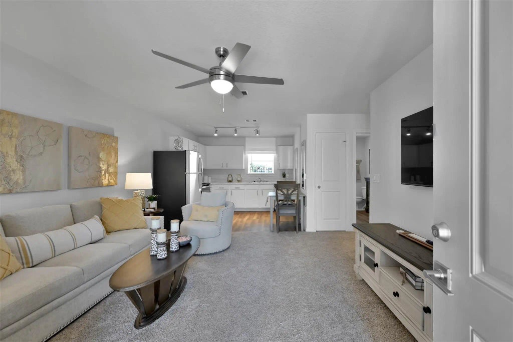 MUST SEE NEW CONSTRUCTION in beautiful gated complex with enchanting entrance and stone elevation! True open concept floor plan. The kitchen is furnished stainless steel microwave, range, refrigerator and dishwasher. Full size washer and dryer and 1 Gig fiber optic AT&T internet included with all units. Exterior Features include Splash Pads, Walking Trail, Amazon Lockers. Also available are additional storage units and reserved parking. Zoned to Recognized Cy-Fair ISD.